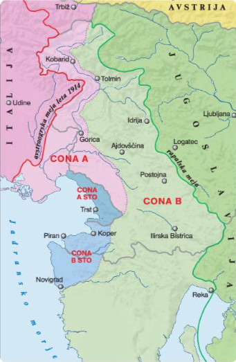 - Cona A: pod zavezniškim očesom, obsega Trst z okolico,