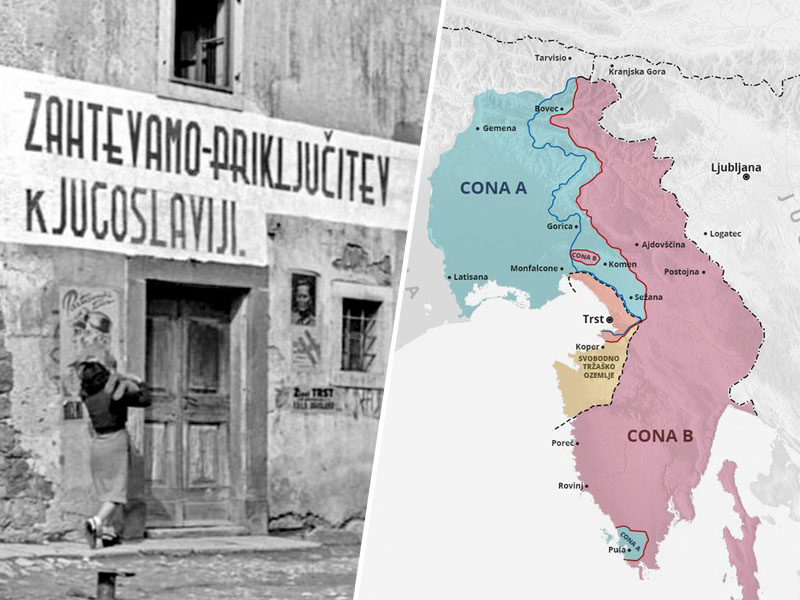 Seveda pa, zakaj bi kaj naredili enostavno, če lahko kompliciramo. Italija 1947 podpiše mirovno pogodbo z zavezniki in jugozahodni del cone A pripade Italiji, večina cone B pa Jugoslaviji. Po domače rečeno so upoštevali francoski predlog, po katerem je Benečija, Rezija, Gorica in Kanalska dolina prišla pod Italijo. Velik del Goriške, del Tržaške, Istro južno od reke Mirne, jadranski otoki in Zadar z okolico pa je dobila Jugoslavija.